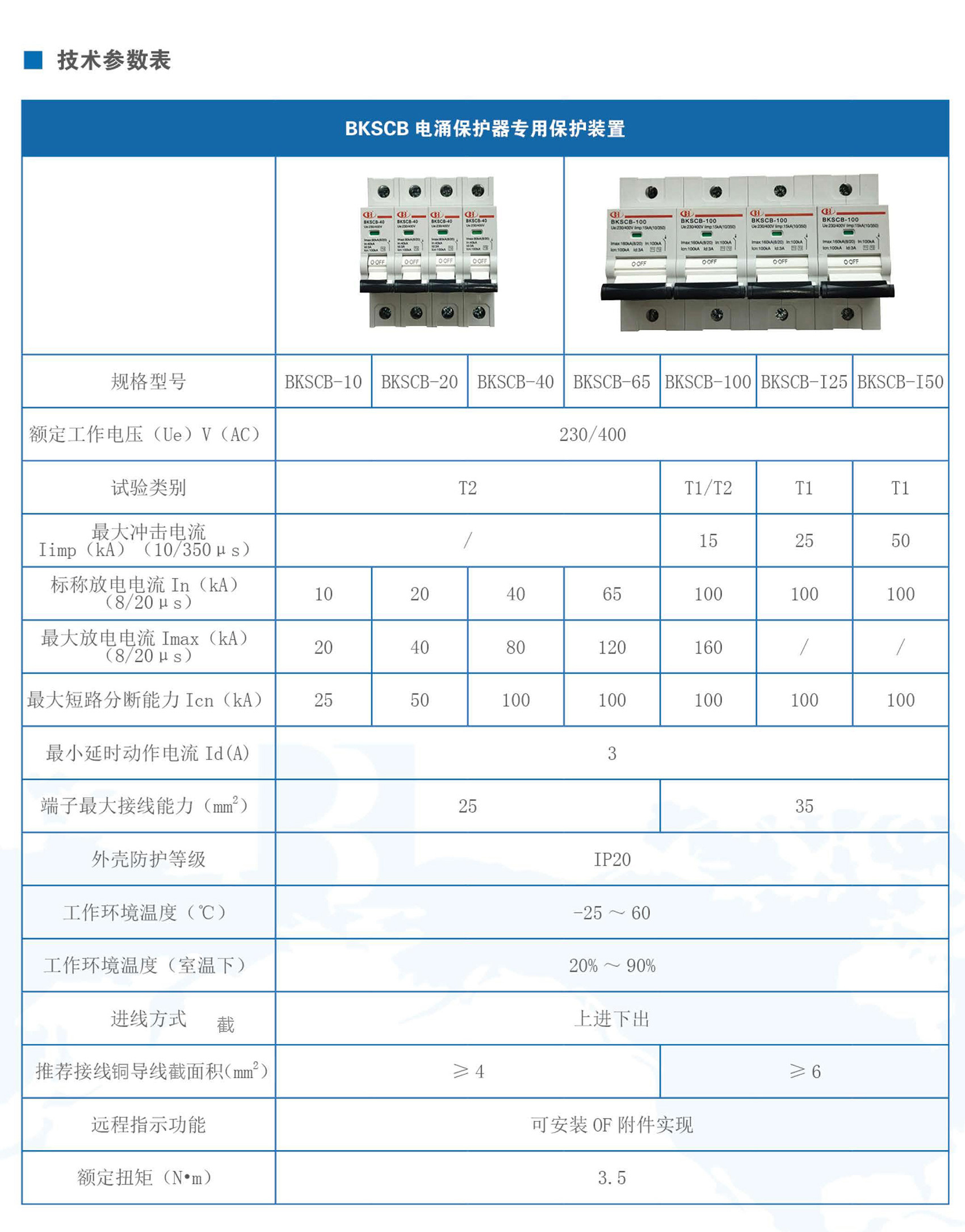 BKSCB系列电涌保护器专用保护装置适用于交流50Hz/60Hz、额定工作电压至400V,需安装SPD(防雷保护器)设备的电路中,为试验类别为Ⅰ类和II类的电涌保护器提供专业的后备保护。本产品符合NB/T 42150标准。