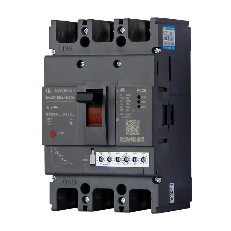 BKM3Z系列智能型塑料外壳式断路器适用于交流50Hz,额定绝缘电压为800V,额定工作电压至 400V,额定电流至 800A的电路中作不频繁转换及电动机不频繁起动之用。具有过载长延时反时限、短路短延时反时限、短路短延时定时限、短路瞬时和欠电压保护功能,能保护线路和电源设备不受损坏。本系列断路器具有隔离功能。本系列断路器可垂直安装 ( 即竖装 ),亦可水平安装 ( 即横装 )。本系列断路器执行标准:IEC 60947-1及GB/T 14048.1 《低压开关设备和控制设备 第1部分:总则》IEC 60947-2及GB/T 14048.2 《低压开关设备和控制设备 第2部分:断路器》IEC 60947-4及GB/T 14048.4 《低压开关设备和控制设备 第4-1部分:接触器和电动机起动器 机电式接触器和电动机起动器(含电动机保护器)》IEC 60947-5及GB/T 14048.5 《低压开关设备和控制设备 第5-1部分:控制电路电器和开关元件 机电式控制电路电器》