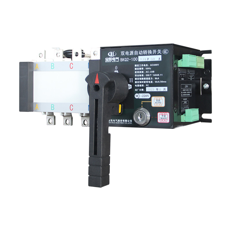 BKQ2系列双电源自动转换开关电器主要用于交流50Hz,额定工作电压400V及以下,额定工作电流16A至1600A的配电或电动机网络中一主一备或互为备用电源转换系统及市电和发电机组的负荷转换。同时可用于不频繁接通与分断电路及线路的隔离之用。产品广泛应用于消防、医院、银行、高层建筑等不允许断电的重要供电场所的输、配电系统及自动化系统。本产品符合GB/T 14048.11《低压开关设备和控制设备 第 6-1 部分:多功能电器 转换开关电器》。