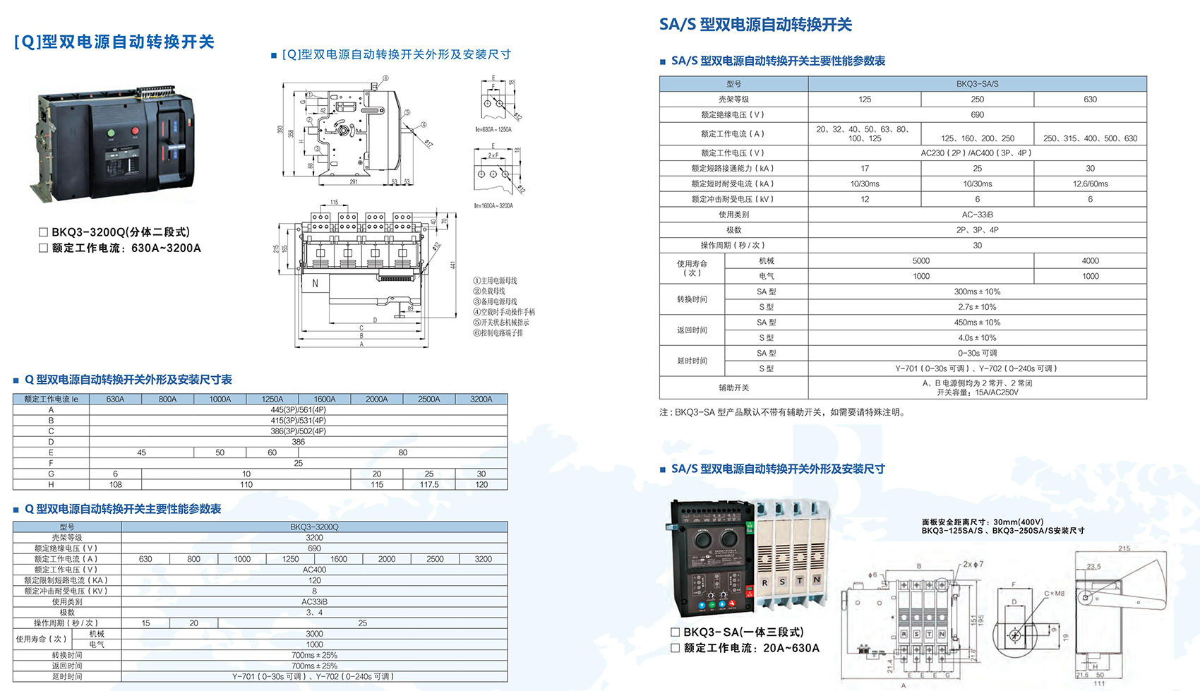 BKQ3-3200Q系列自动转换开关电器适用于交流50/60Hz,额定工作电压400V,额定电流800A至3200A的双路配电系统中,产品由开关本体与转换控制器两部分组成,本体采用电磁线圈驱动,转换速度快;转换控制器具有对两路三相电源的过电压、欠电压、缺相等故障检测功能;同时带有发电机组启、停信号输出。主要应用于医院、商场、银行、化工、高层建筑、军事设施、消防等不允许断电的重要场所。产品符合GB/T 14048.11《低压开关设备和控制设备 第 6-1 部分:多功能电器 转换开关电器》。