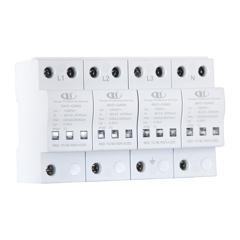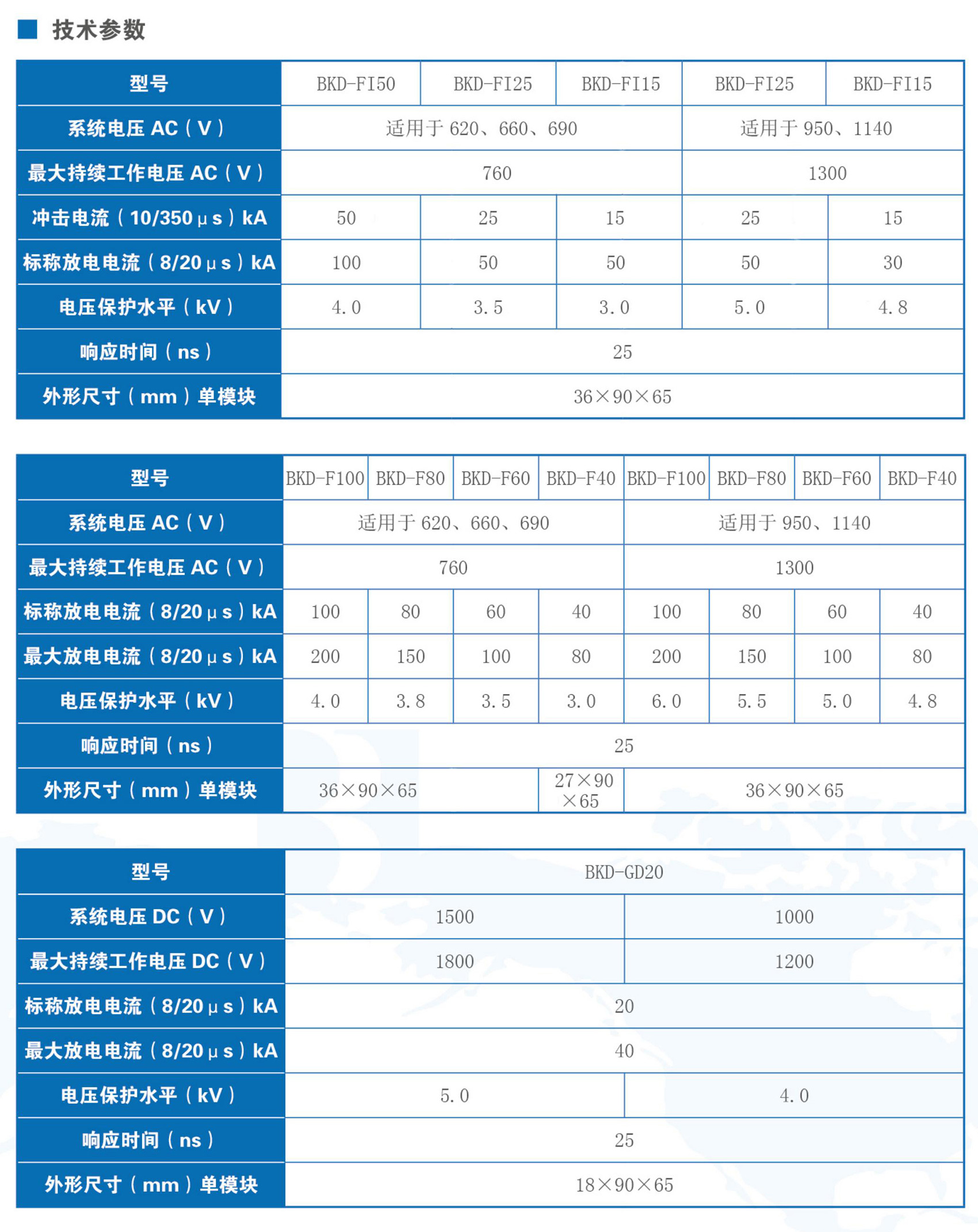 BKD系列新能源专用电涌保护器均采用了非线性特性极好的过电压保护元件。在正常情况下,电涌保护器处于高阻状态,泄漏漏电流极低。当系统出现电涌过电压时,电涌保护器立即在纳秒级内导通,将过电压的幅值限制在设备的安全工作范围内,同时将电涌能量导入大地释放掉;随后电涌保护器又迅速变为高阻状态,从而不影响风电、光伏系统的正常工作。产品符合GB/T 18802.11、GB/T 18802.11标准。