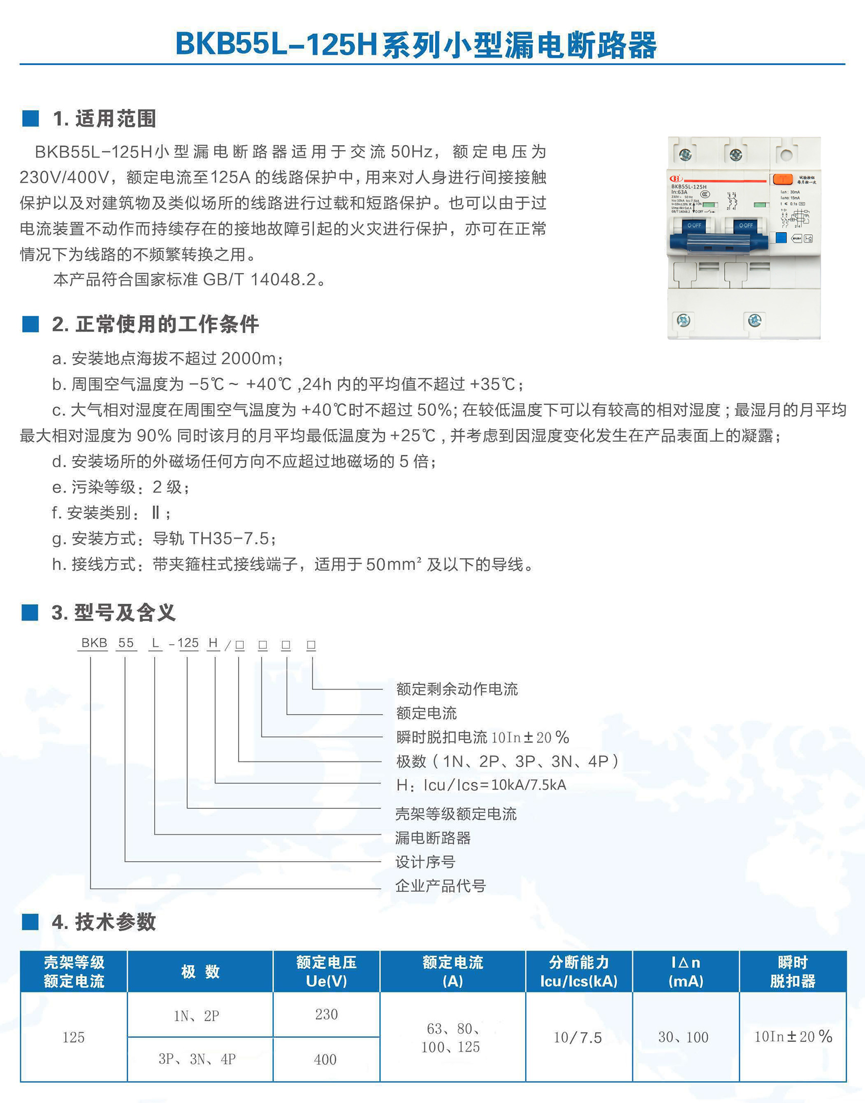 BKB55L-125H系列带剩余电流保护小型断路器适用于交流50Hz、额定电压至400V,额定电流63~125A 的线路中。作为人身触电和设备漏电保护之用,并可用于线路和电气设备的过载以及短路保护。在正常情况下亦可用于不频繁的通断操作。本产品符合GB/T 14048.2、IEC 60947-2标准。